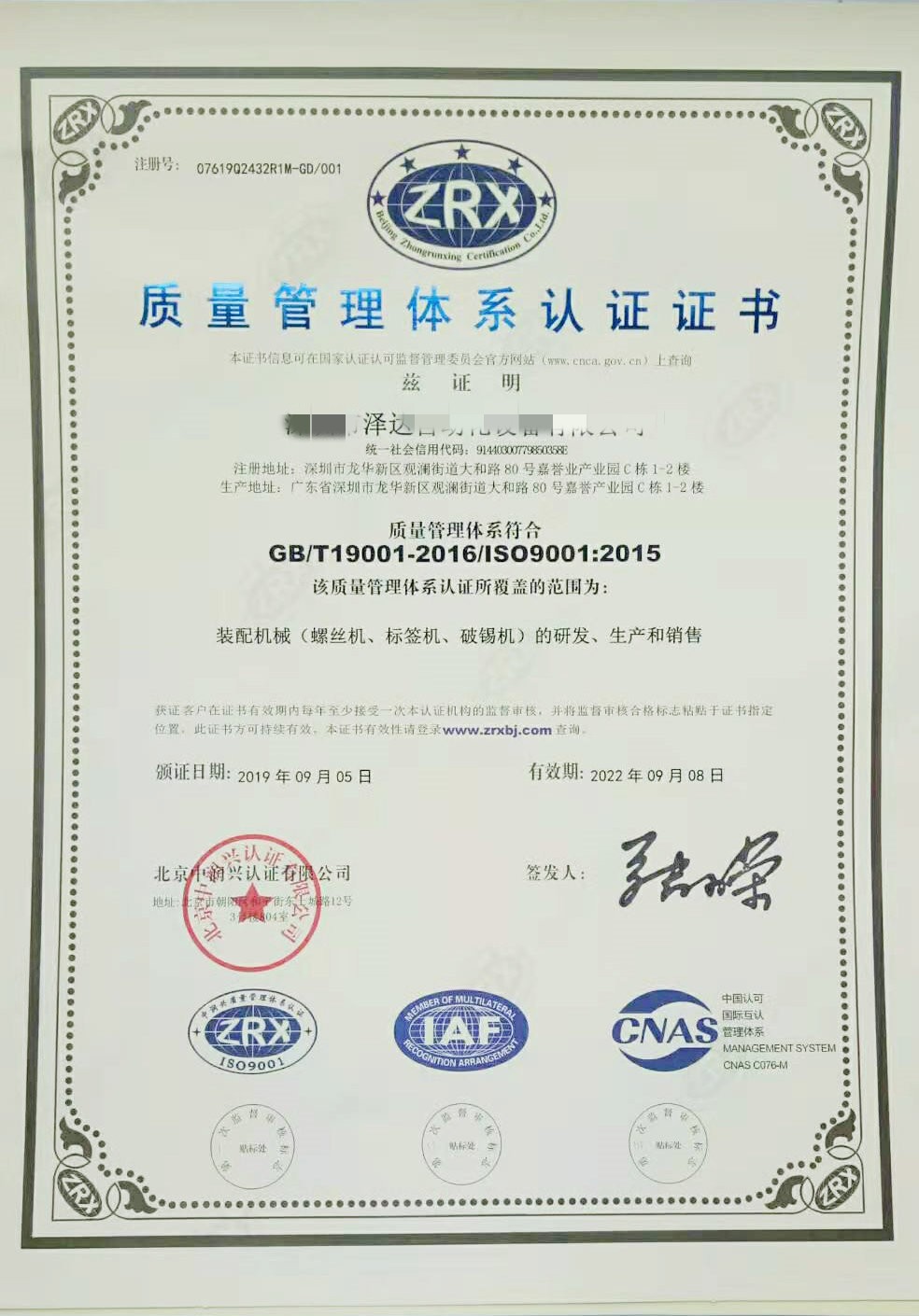 螺絲機專業(yè)生產(chǎn)廠家已通過ISO9001質(zhì)量管理體系認(rèn)證